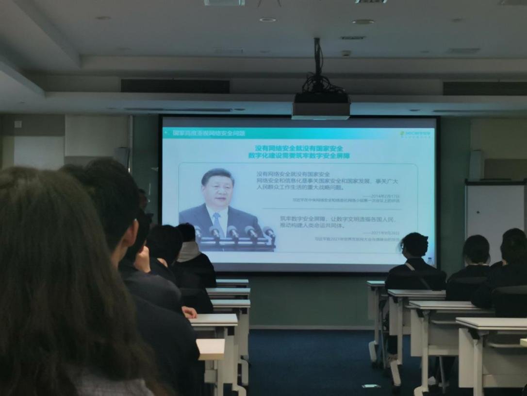然后,专家对网络安全行业现状进行了深入的分析。他详细讲述了当前国内外网络安全领域的挑战和趋势,包括新兴的网络威胁、技术发展、法规要求等。这些信息不仅让学生们了解了行业发展现状,增强了信息安全危机意识,也让他们深刻领会了习近平总书记所讲的“没有网络安全就没有国家安全,网络安全和信息化是事关国家安全和国家发展、事关广大人民群众工作生活的重大战略问题。”的内涵和要义。