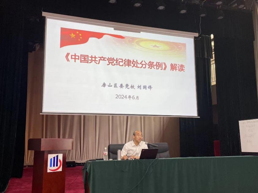 为扎实推进党纪学习教育,引领学校广大党员干部职工进一步学纪、知纪、明纪、守纪,6月19日下午,学校特别邀请房山区委党校(行政学院)教研室主任、副教授刘国峰对新修订的《中国共产党纪律处分条例》授课解读。学校党委副书记、校长冯瑞臣主持并讲话。