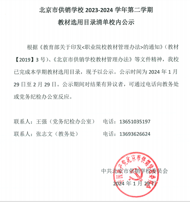 北京市供销学校2023-2024学年第二学期教材选用目录清单校内公示