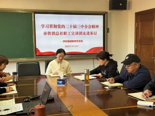 2024年11月6日,继续教育党支部召开支部党员大会。会议由支部书记张玉超同志主持,会议分为两个阶段:学习贯彻党的二十届三中全会精神市供销总社职工宣讲团走进基层宣讲及党员学习。