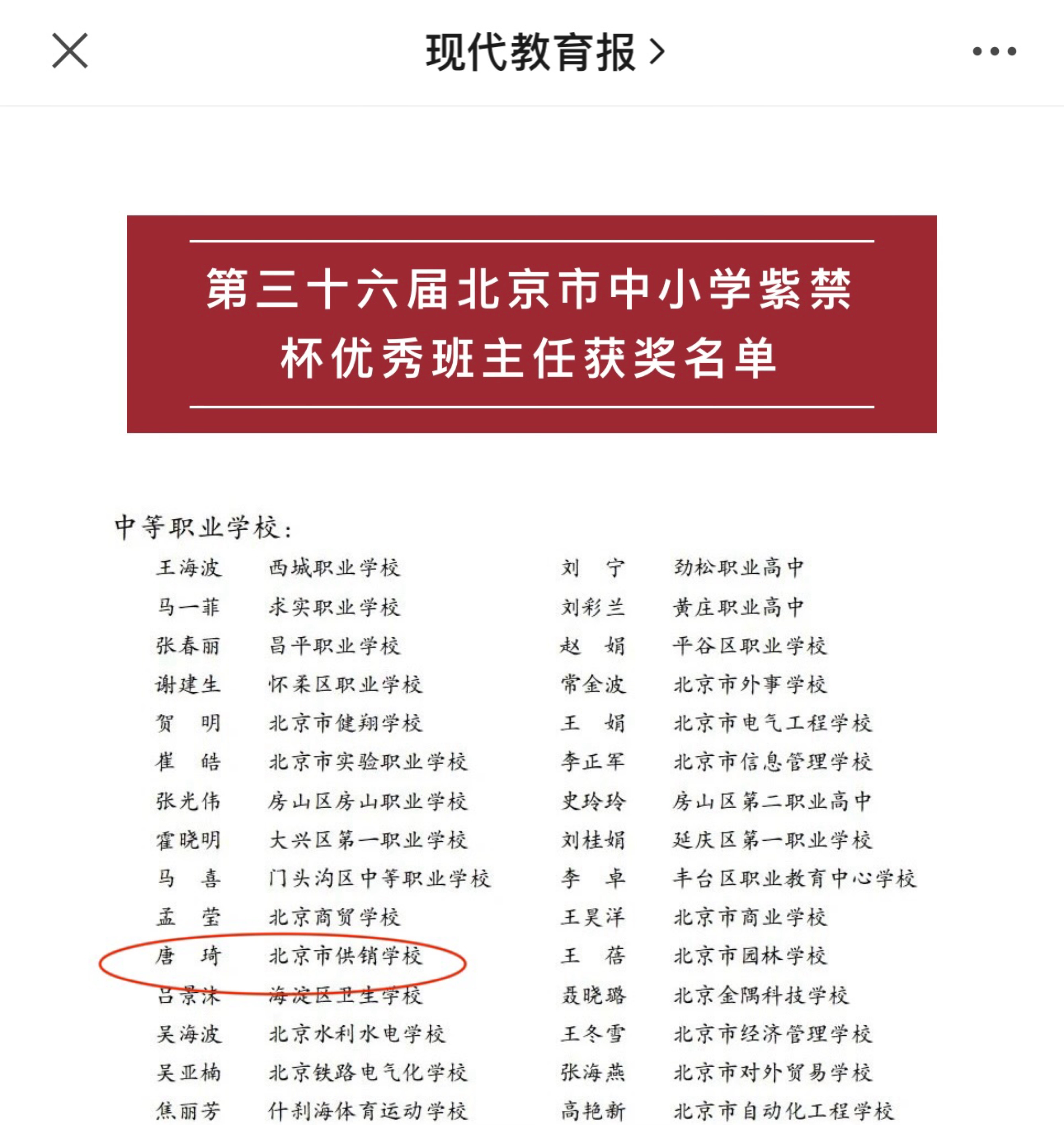 近日,第三十六届北京市中小学紫禁杯优秀班主任获奖名单出炉,我校招生就业处唐琦老师荣获北京市中小学紫禁杯“优秀班主任”称号。
