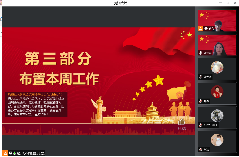 薛飞主任强调,升旗仪式将会持续举行,希望全体同学按照要求参与,及时签到,尊重升国旗仪式。随后,薛飞主任就上周工作情况进行总结,提出要求,针对本周工作安排进行了部署,并强调需要注意的问题等。