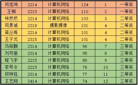 本次技能月参赛选手来自2个专业的8个班级,共20名学生。通过激烈角逐,火热比拼,选手们收获了友谊,刷新了个人成绩。获奖名单如下: