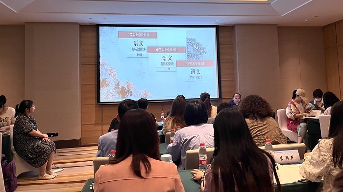 语文教师在王海霞老师的带领下进行《语文·基础模块(上册)》教材内容逻辑框架说明、教材使用及教学设计建议,《喜看稻菽千重浪——记首届国家最高科学技术奖获得者袁隆平》、《子路、曾皙、冉有、公西华侍坐》和《念奴娇·赤壁怀古》示范说课,语文教学设计方案展示。