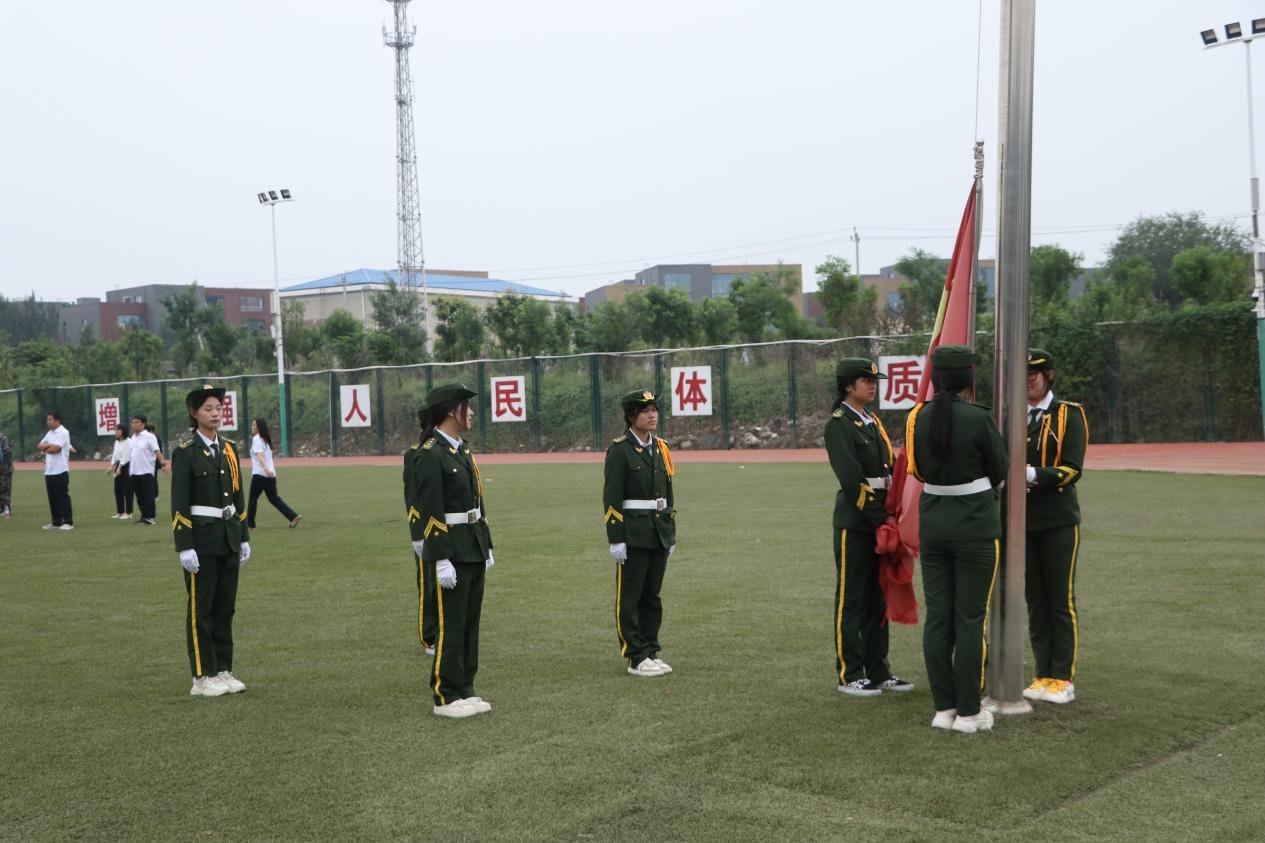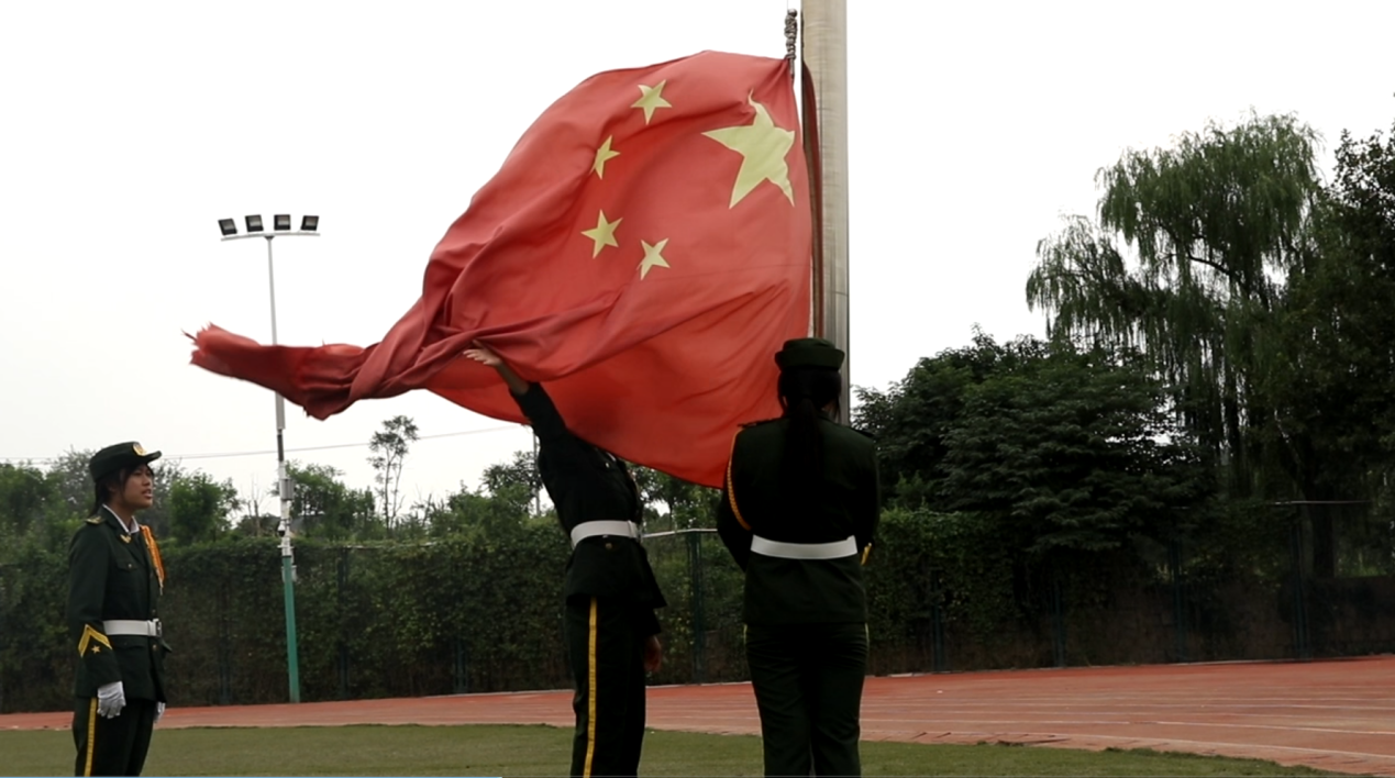 开学典礼第一项,全体师生面向国旗,升国旗,奏国歌,行注目礼。