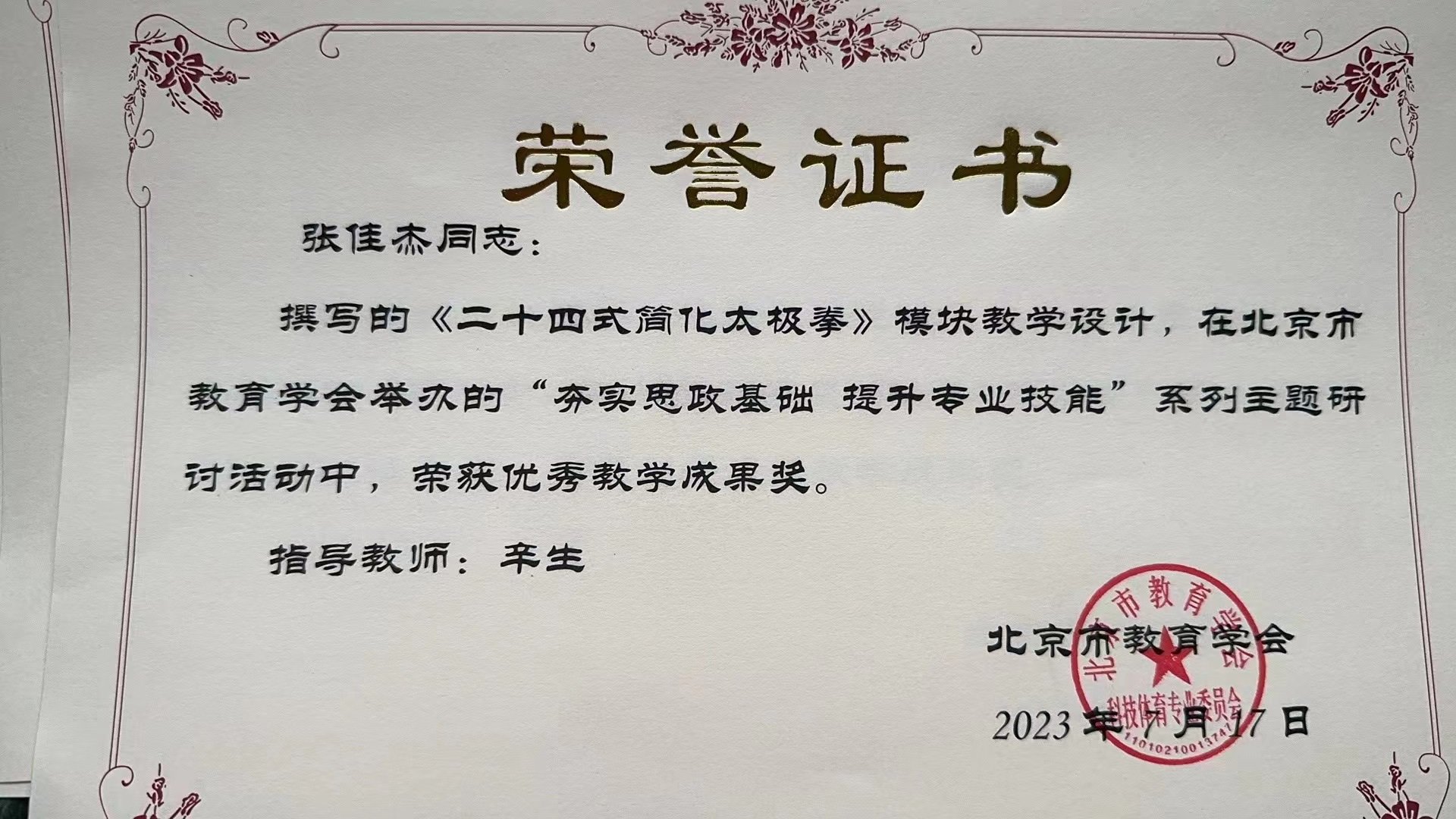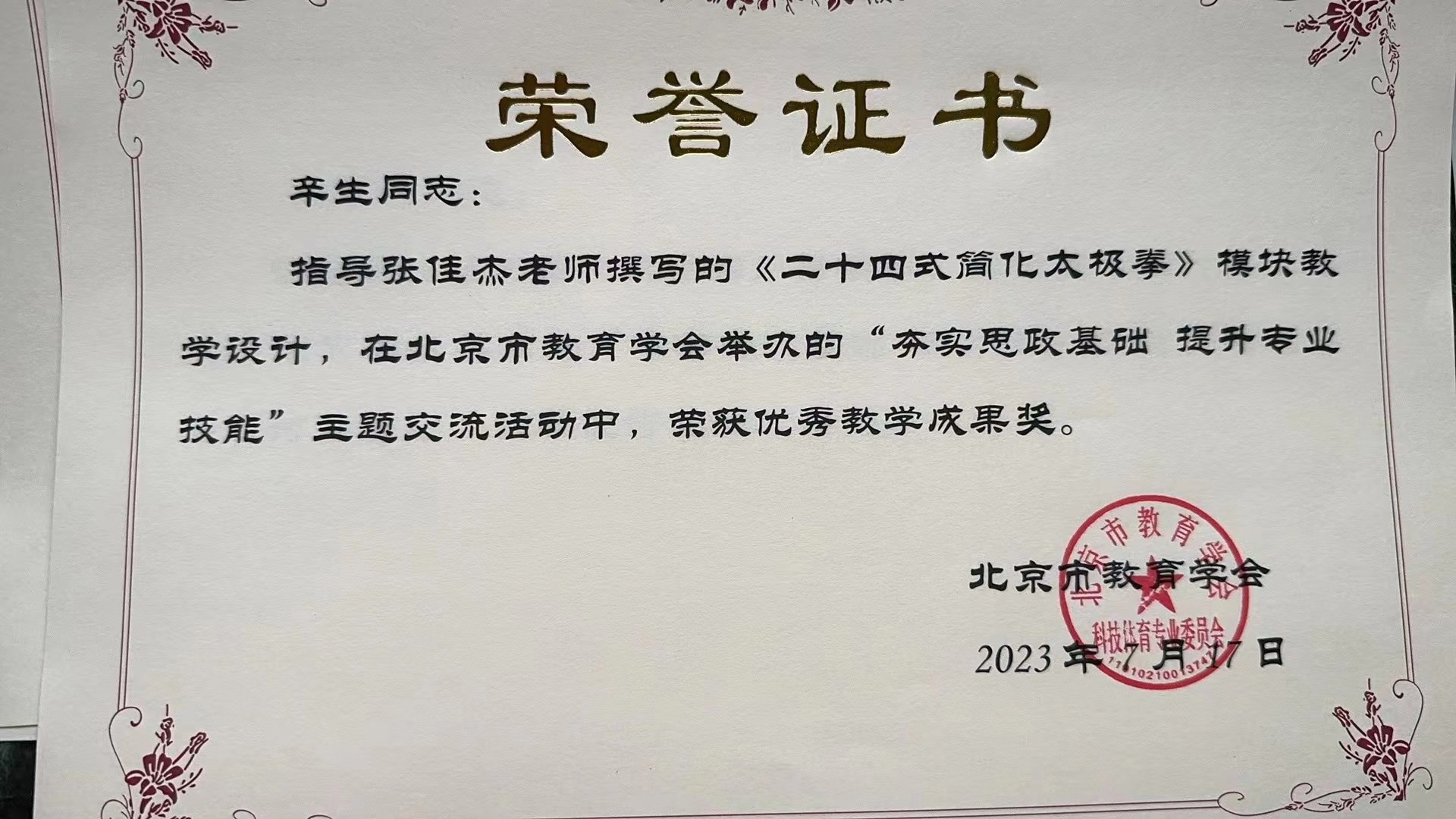 辛生同志:指导张佳杰老师撰写的《二十四式简化太极拳》模版教学设计,在北京市教育学会举办的“夯实思政基础 提升专业技能”主题交流活动中,荣获优秀教学成果奖。