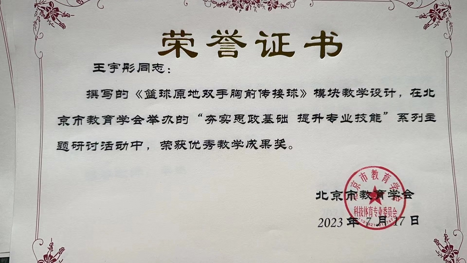 王宇彤同志:撰写的《篮球原地双手胸前传接球》模块教学设计,在北京市教育学会举办的“夯实思政基础 提升专业技能”系列主题研讨活动中,荣获优秀教学成果奖。