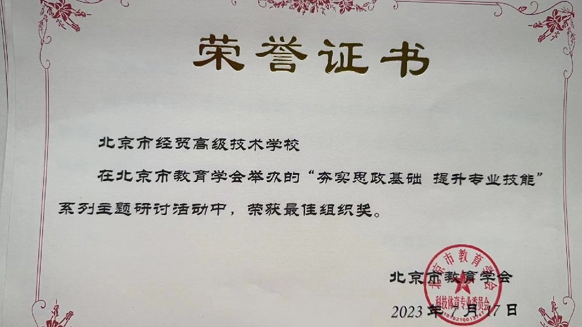 北京市经贸高级技师学校在北京市教育学会举办的“夯实思政基础 提升专业技能”系列主题研讨活动中,荣获最佳组织奖。