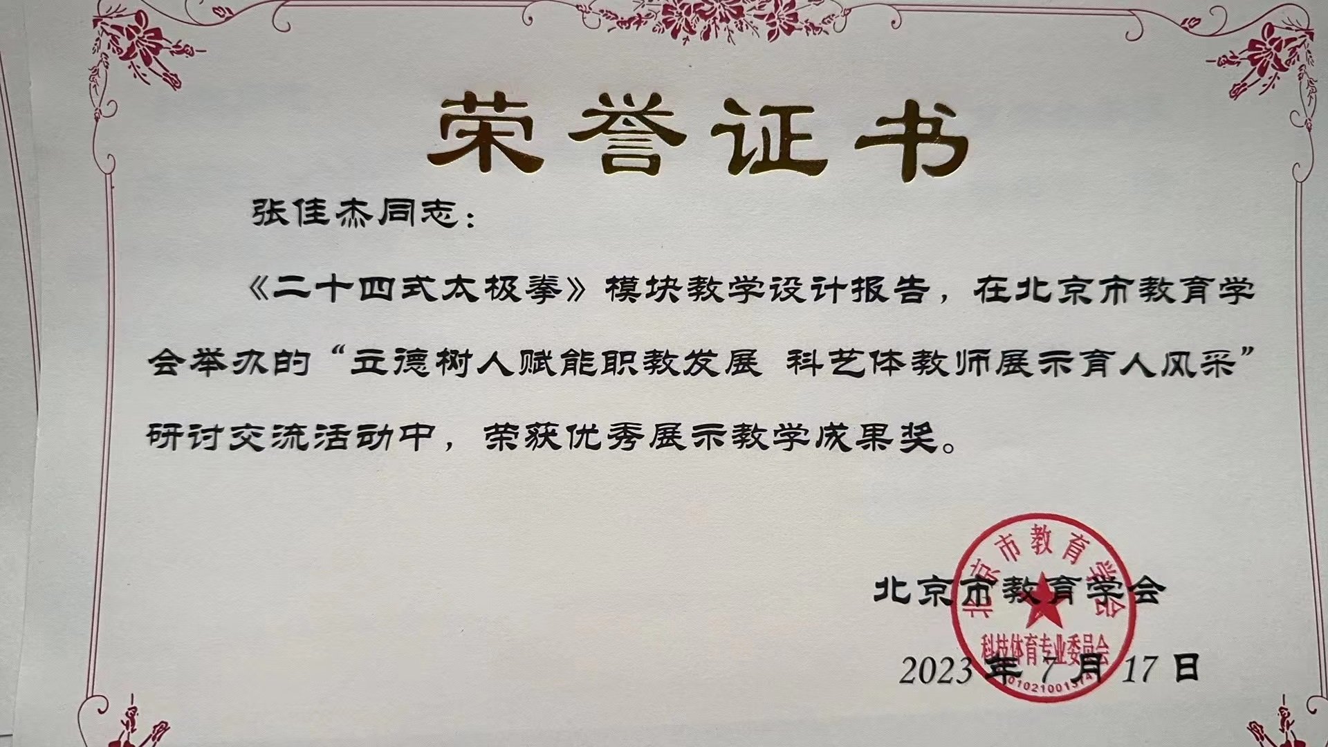 张佳杰同志:《二十四式太极拳》模块教学设计报告,在北京市教育学会举办的“立德树人赋能职教发展 科艺体教师展示育人风采研讨交流活动中,荣获优秀展示教学成果奖。