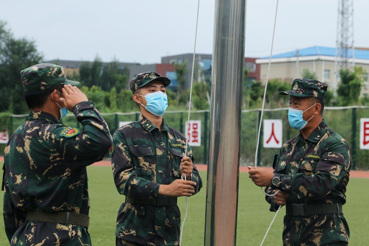本次军训开营仪式在庄严的国歌中拉开序幕。在国歌声中,全体人员面向国旗,端庄肃立,师生行注目礼,教官行军礼,凝视国旗缓缓升起。