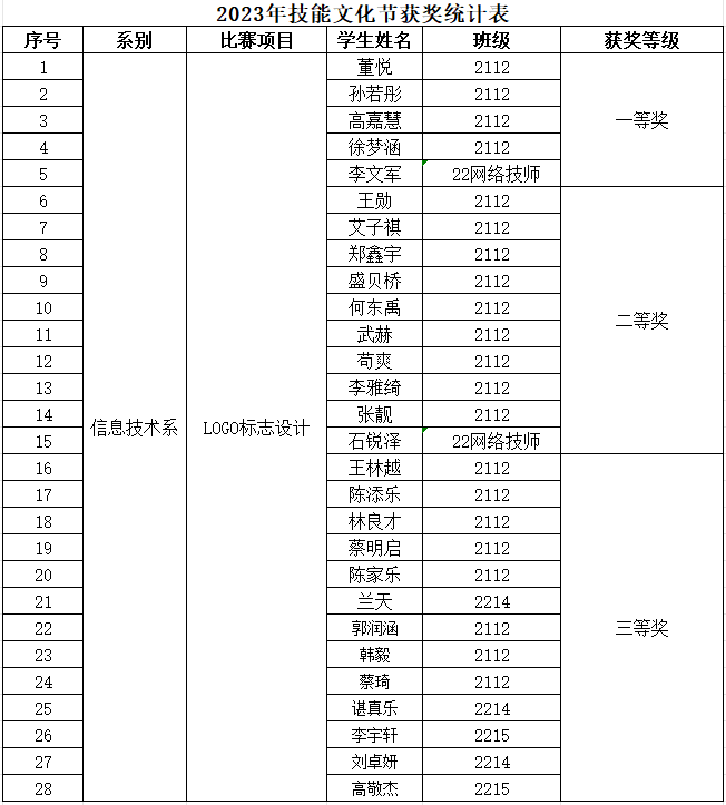 “标志”是具有某种特殊含义或象征意义的符号,具有表达意义、情感或指令的作用。“LOGO标志设计”比赛在锻炼学生计算机操作能力的同时也提高了学生的审美及创作能力。比赛前期筹备阶段准备充分、计划周全、考虑详实是大赛取得成功的关键,经过层层选拔共有48份作品进入决赛,最终筛选出获奖作品28份,成绩如下: