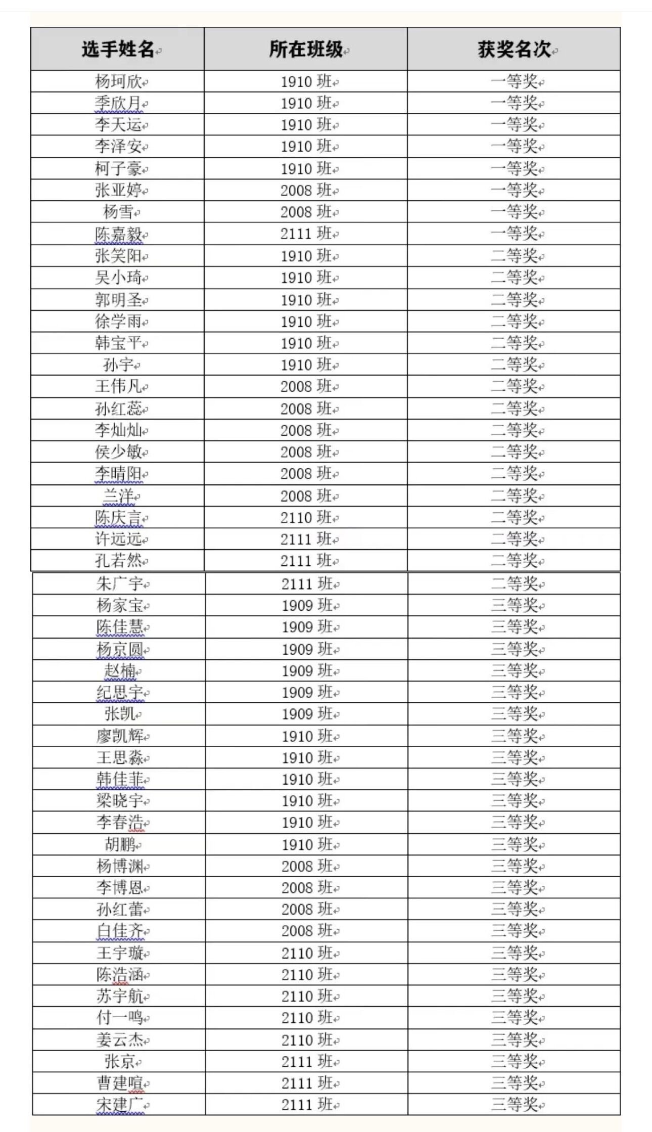 本次比赛参赛班级有1909班、1910班、2008班、2110班以及2111班,5个班级共计82人。在比赛中,选手们认真研究赛题要求,严格按照流程有计划有步骤地制作,表现出了较高的技能水平。根据比赛规则,本次比赛获得一等奖8人,二等奖16人,三等奖24人。具体获奖及人员名单如下: