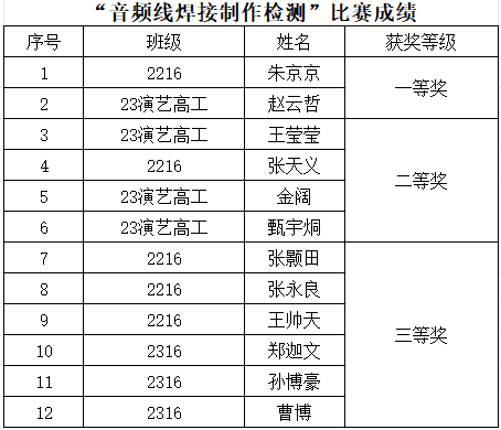 比赛中,选手们认真研究赛题要求,严格按照演艺专业施工流程有计划有步骤地实施制作,对于技术难点能够合理解决,工具仪表使用合理,表现出较好的责任意识,出色的完成了本次音响音频线焊接制作大赛的所有项目。最终成绩如下: