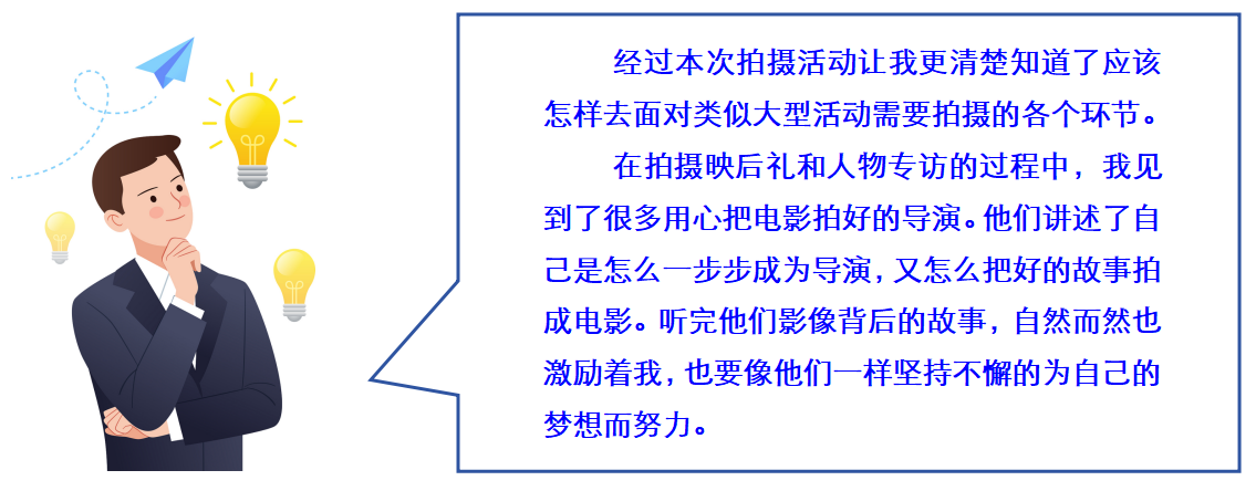 通过本次活动,学生们感受颇多。通过大型活动的工作实操和企业老师辛勤指导,将在校所学专业知识和拍摄技巧进行进一步巩固和提升: