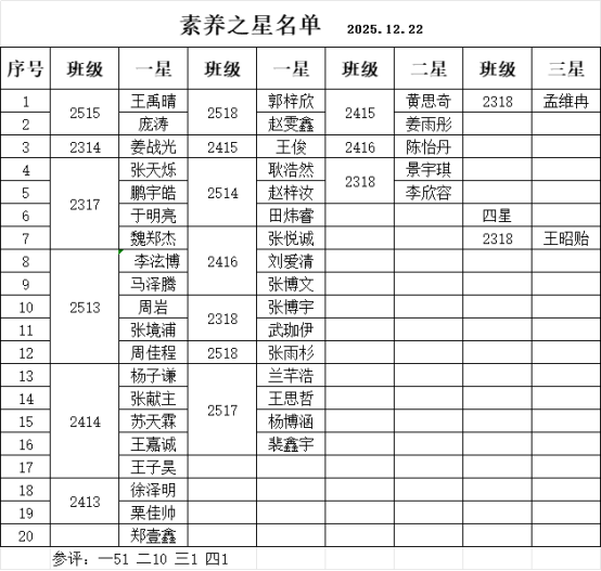 本次评选设立“一星”至“四星”四个层级,经过学生自主申报、班级初步考核、系部综合评审等环节,最终共评选出一星标兵36人、二星标兵5人、三星标兵1人、四星标兵1人,具体名单如下: