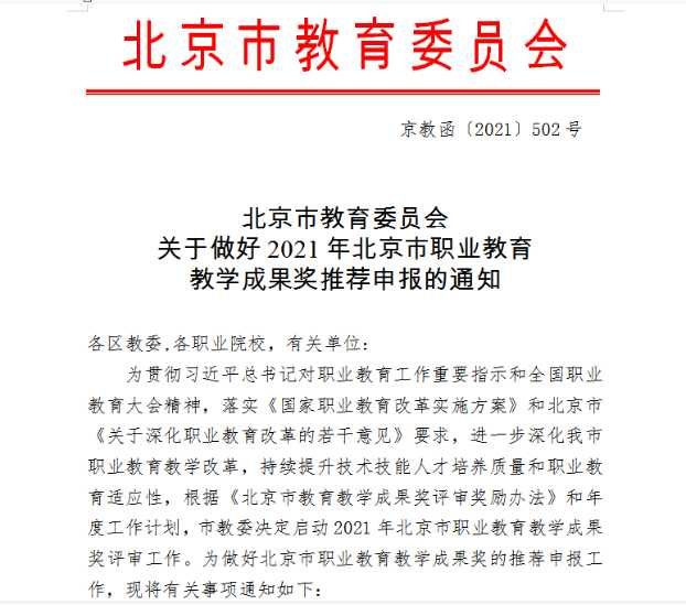 日前,北京市教育委员会发布了关于《关于做好2021年北京市职业教育教学成果奖推荐申报的通知》,职教所积极响应,组织完成了申报工作。