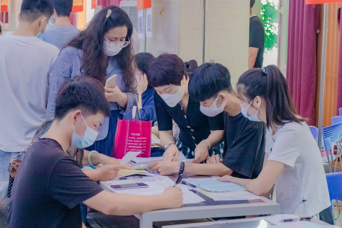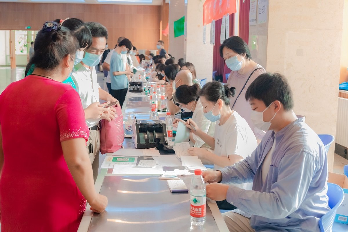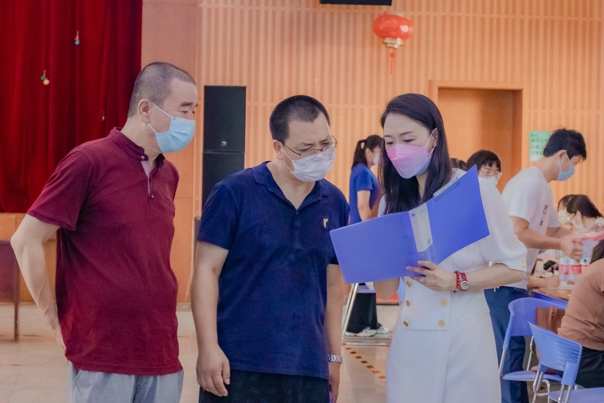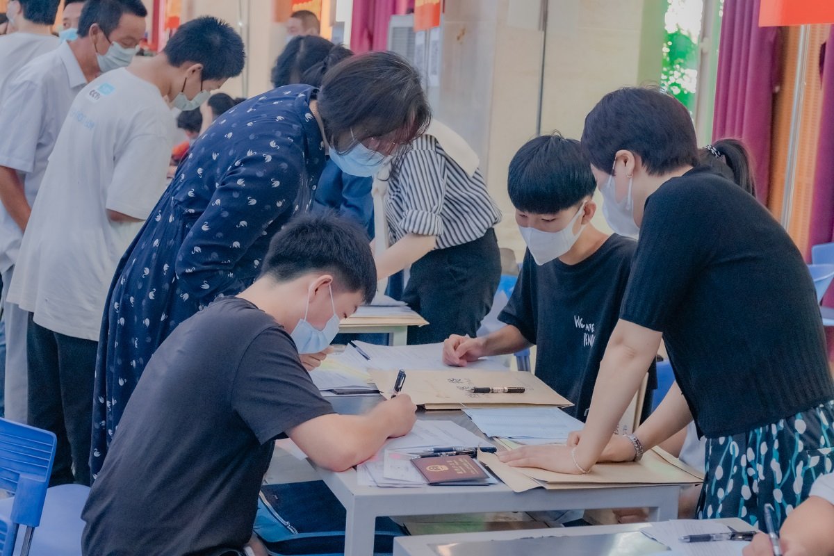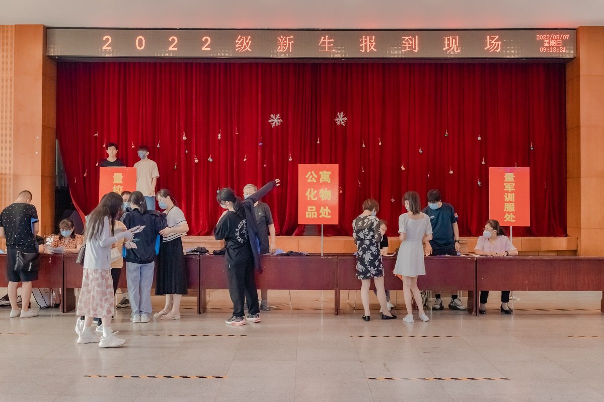 老师及工作人员们有条不紊地完成登记、审查、收费、测量校服等工作,并耐心为家长们解答各种问题;校外安保人员顶着烈日指挥交通、验码测温;后勤保障人员奔波不停,提供各种支持;学生会、礼仪队服务人员,为注册报到的工作提供协助。